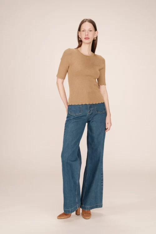 Il colore ocra, caldo e sofisticato, dona carattere al look, rendendo la maglia ideale sia per outfit casual-chic da giorno sia per combinazioni più eleganti da sera.