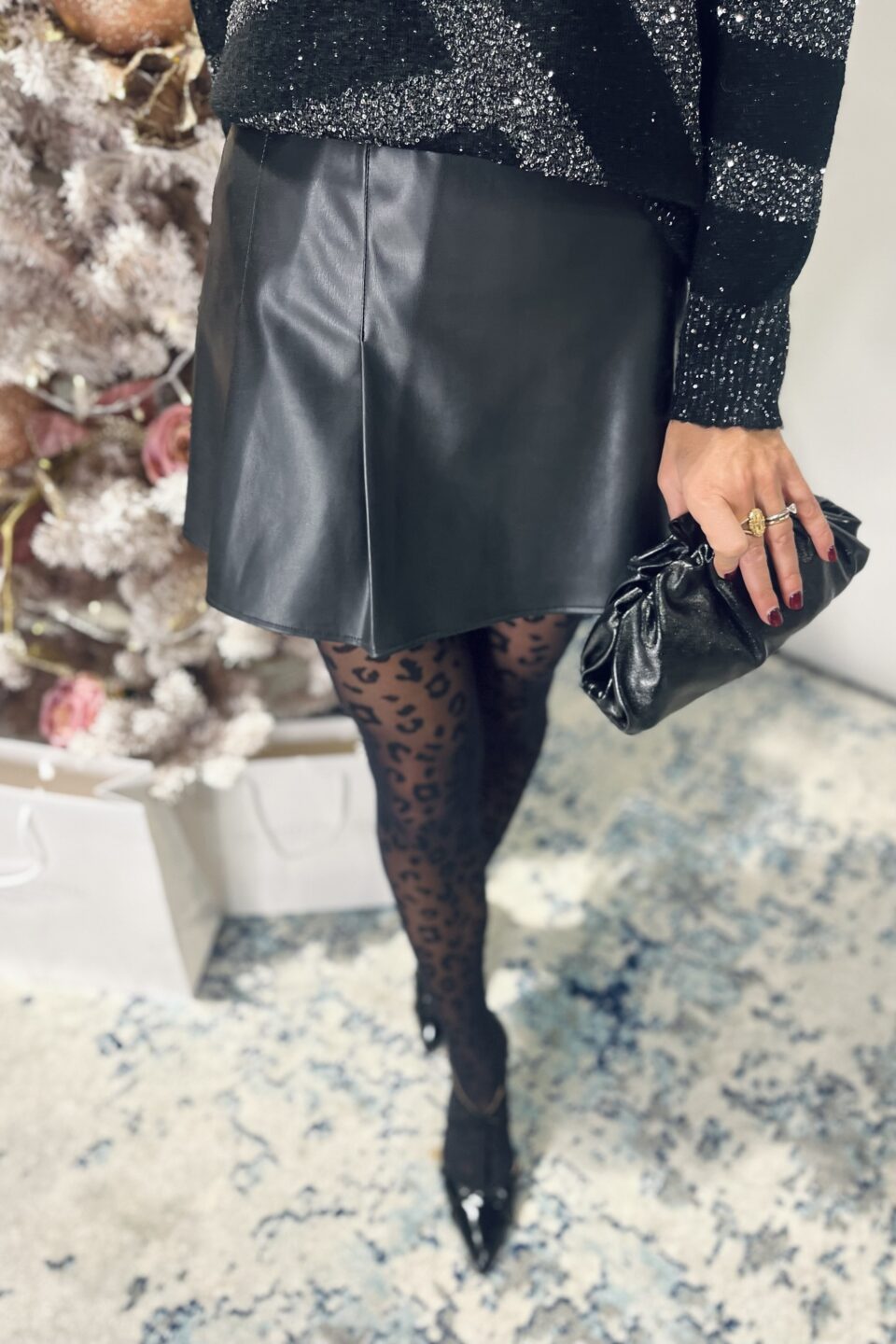 Scegli la nostra minigonna in finta pelle nera per un look deciso, contemporaneo e di tendenza.