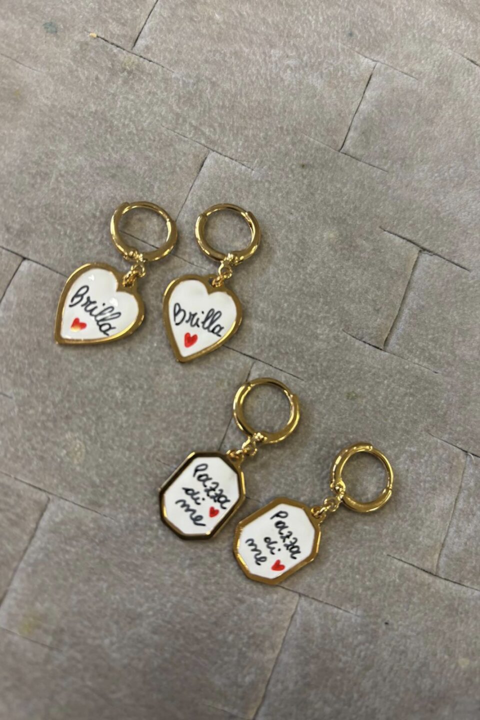 Questi orecchini sono interamente su commissione: puoi scegliere una scritta a tuo piacere (fino a 6 lettere) oppure due parole diverse, per dare forma a un gioiello davvero originale e significativo.