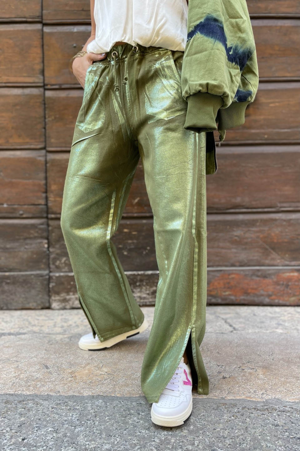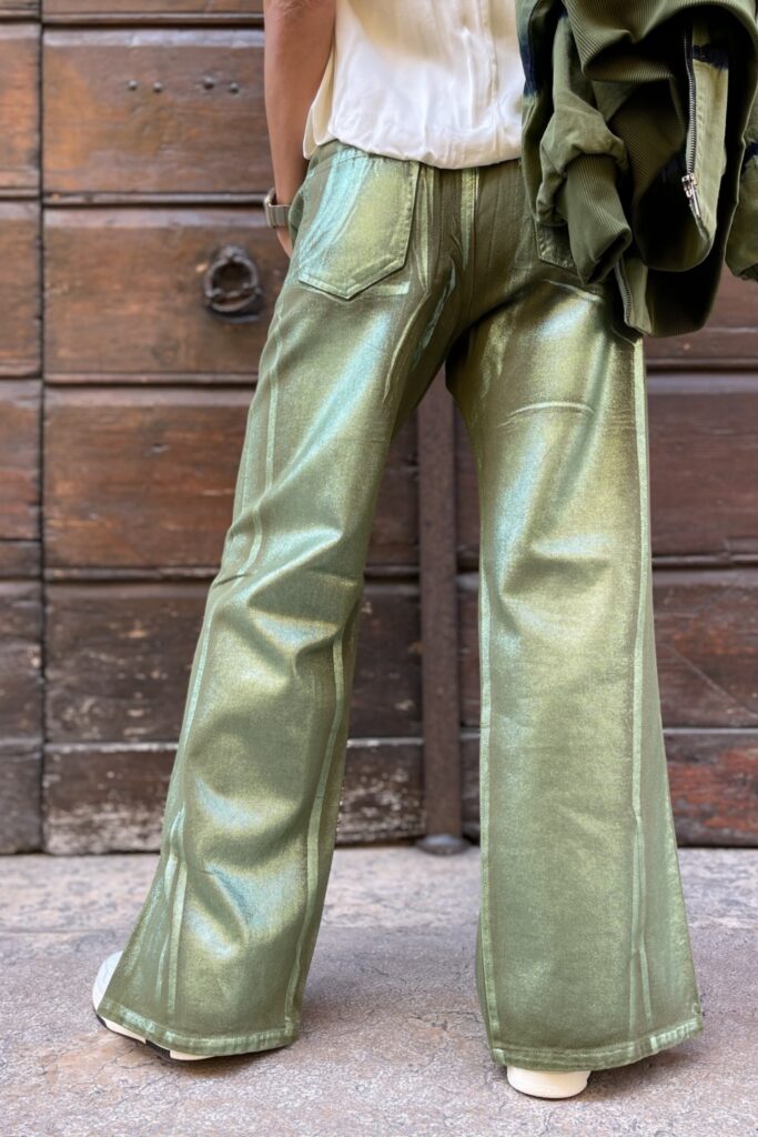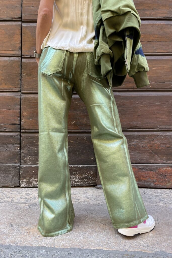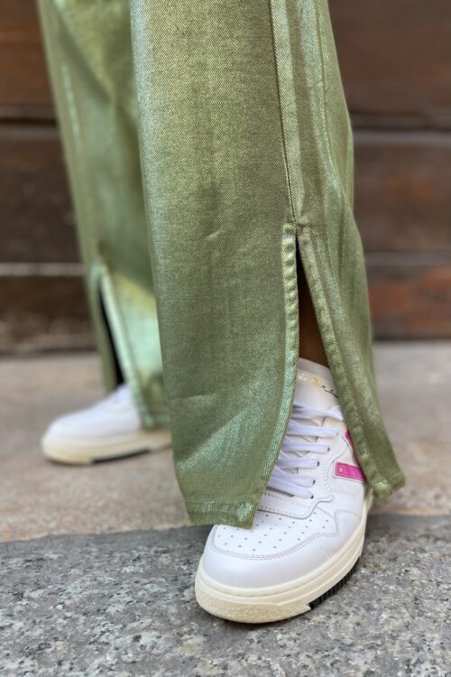 Pantalone green laminato regular con coulisse e elastico in vita spacchetti su fondo 4 tasche 100% cotone