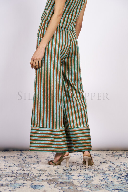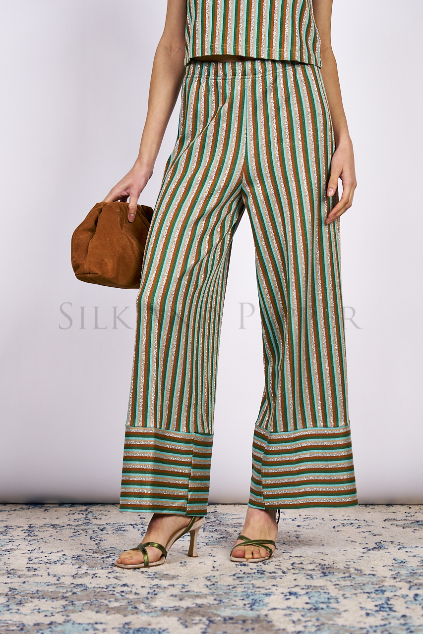 Le righe multicolor – verde ottanio, ruggine, azzurro e preziosi riflessi argento lurex – creano un gioco luminoso che cattura lo sguardo senza mai risultare eccessivo. La gamba ampia slancia, accarezza la figura e dona quell’allure rilassata ma chic che trasforma anche il look più semplice in qualcosa di memorabile.