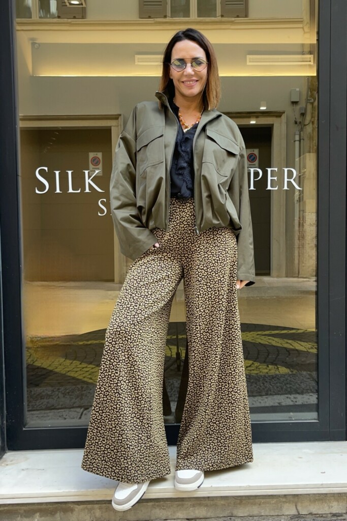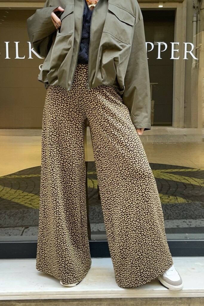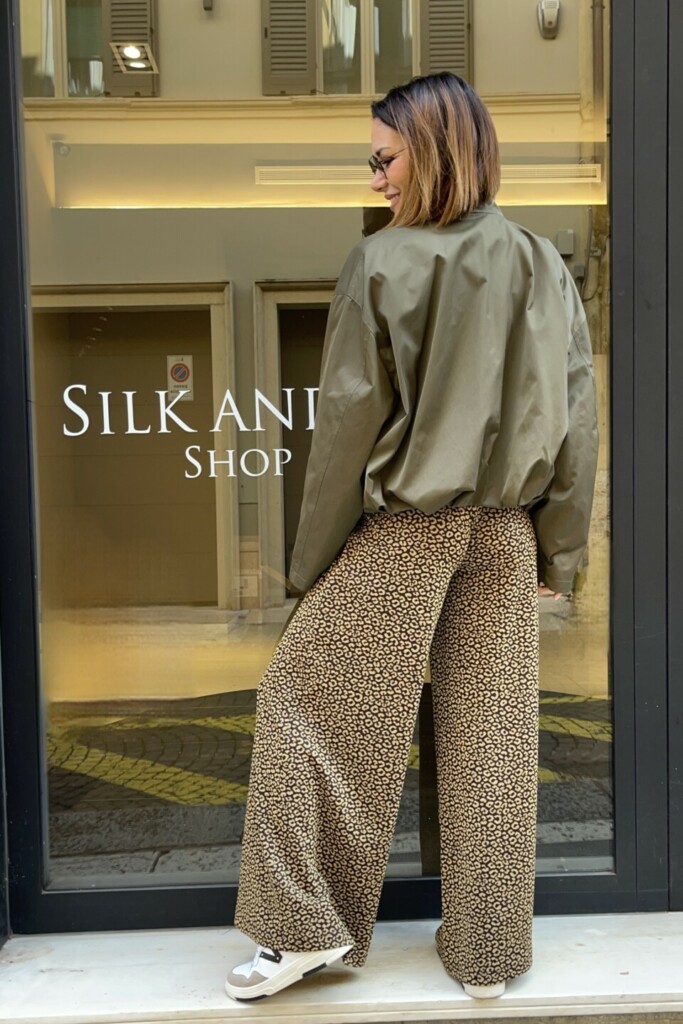 La stampa Oro Macu, distintiva e ricercata, dona personalità e rende il pantalone il vero protagonista dell’outfit. Perfetto da abbinare a top minimal, camicie fluide o blazer strutturati, si presta a look casual chic o più sofisticati, trasformandosi facilmente in base all’occasione.