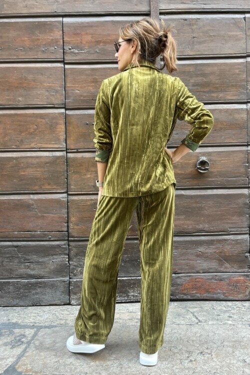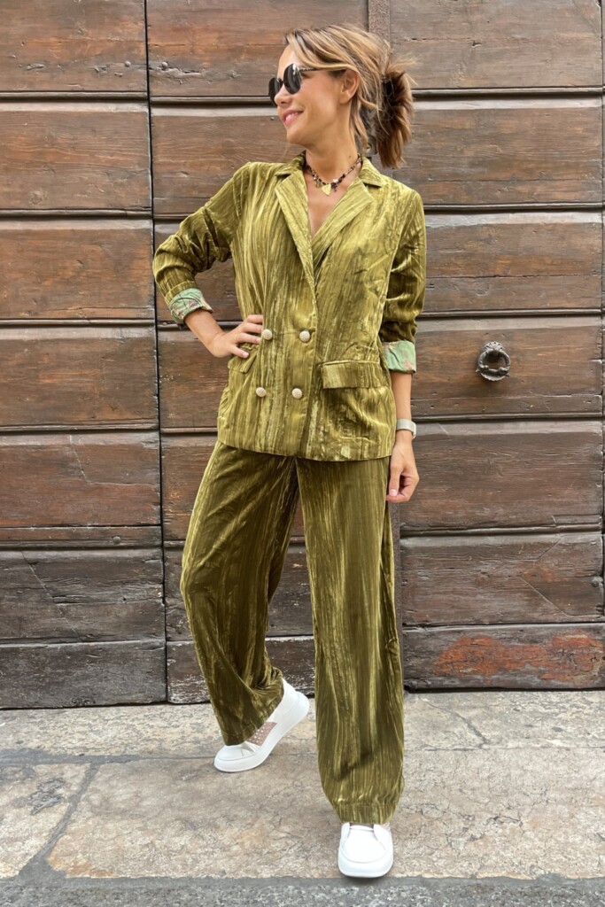 morbido pantalone in velluto con zip e bottone gioiello color oro