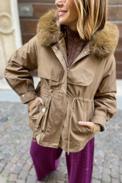 La coulisse in vita valorizza la silhouette e permette di regolare la vestibilità, mentre le tasche foderate in morbido finto pelo offrono calore e praticità.