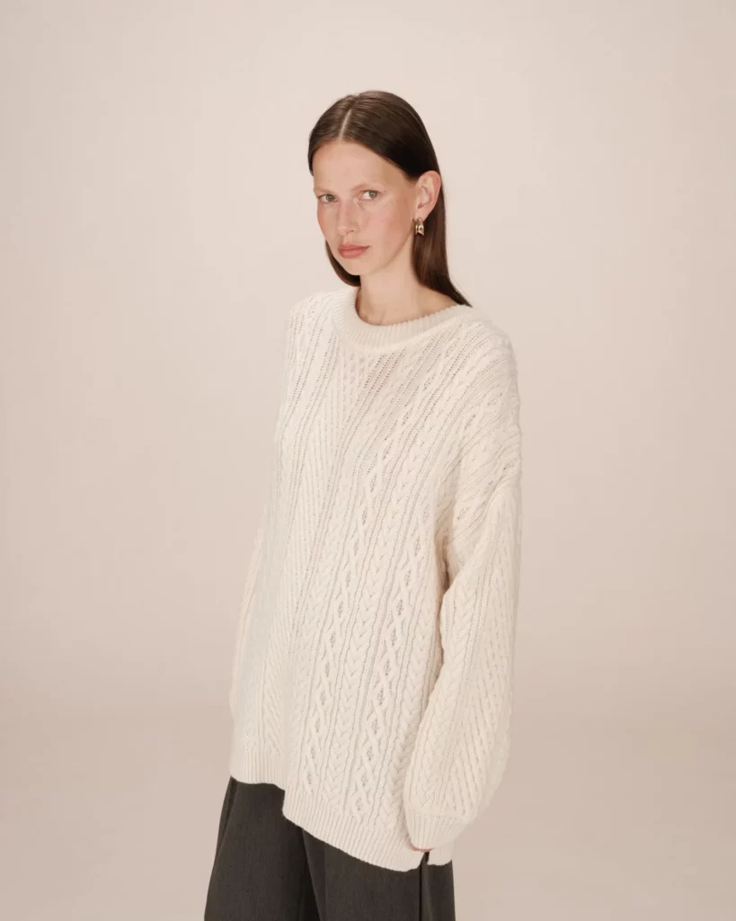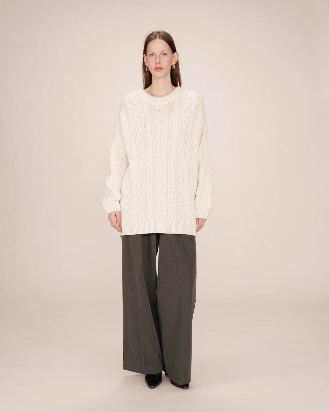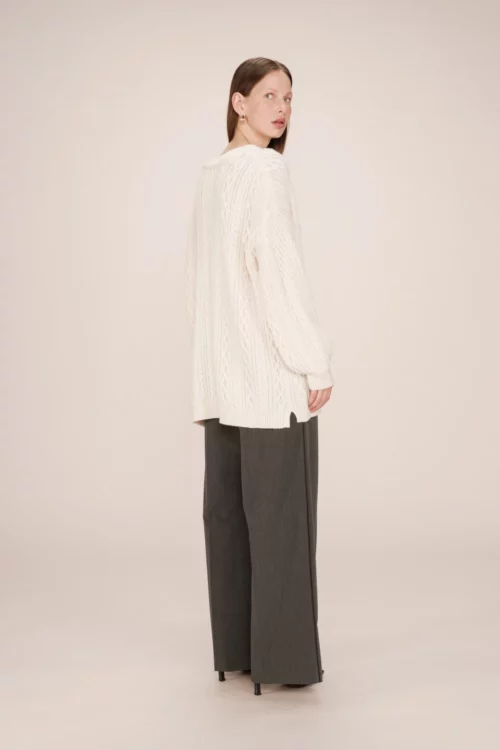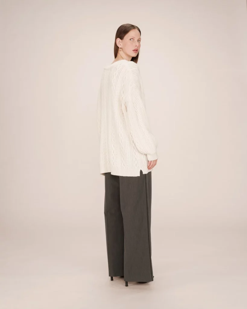 La vestibilità oversize e le spalle scese creano una silhouette rilassata, ideale da abbinare a jeans, pantaloni eleganti o gonne per outfit versatili e contemporanei. Lo scollo rotondo e le finiture a coste su collo, maniche e orlo aggiungono un tocco di struttura e raffinatezza al design.