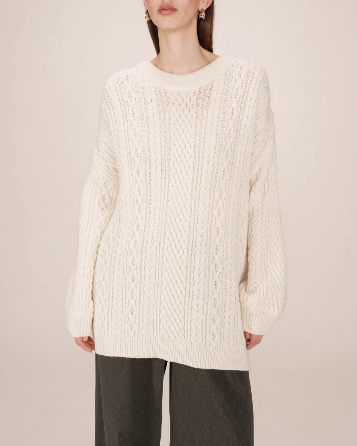 Caldo, confortevole e dallo stile senza tempo, questo maglione oversize da donna in maglia a trecce è il capo perfetto per affrontare la stagione fredda con un look casual e moderno. La lavorazione a trecce in morbido misto lana (70% acrilico, 30% lana) dona consistenza e autenticità, garantendo allo stesso tempo leggerezza e comfort sulla pelle.