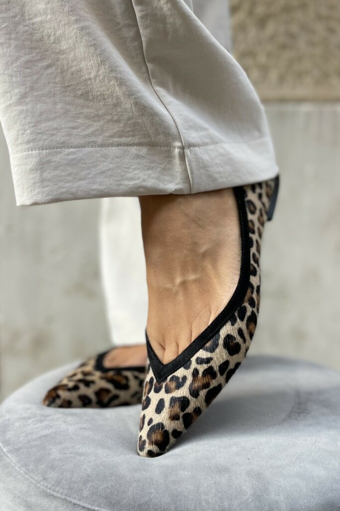 Scarpa flat animalier in cavallino con profili neri e tacco 1 cm. Eleganza artigianale, comfort e stile Made in Italy.