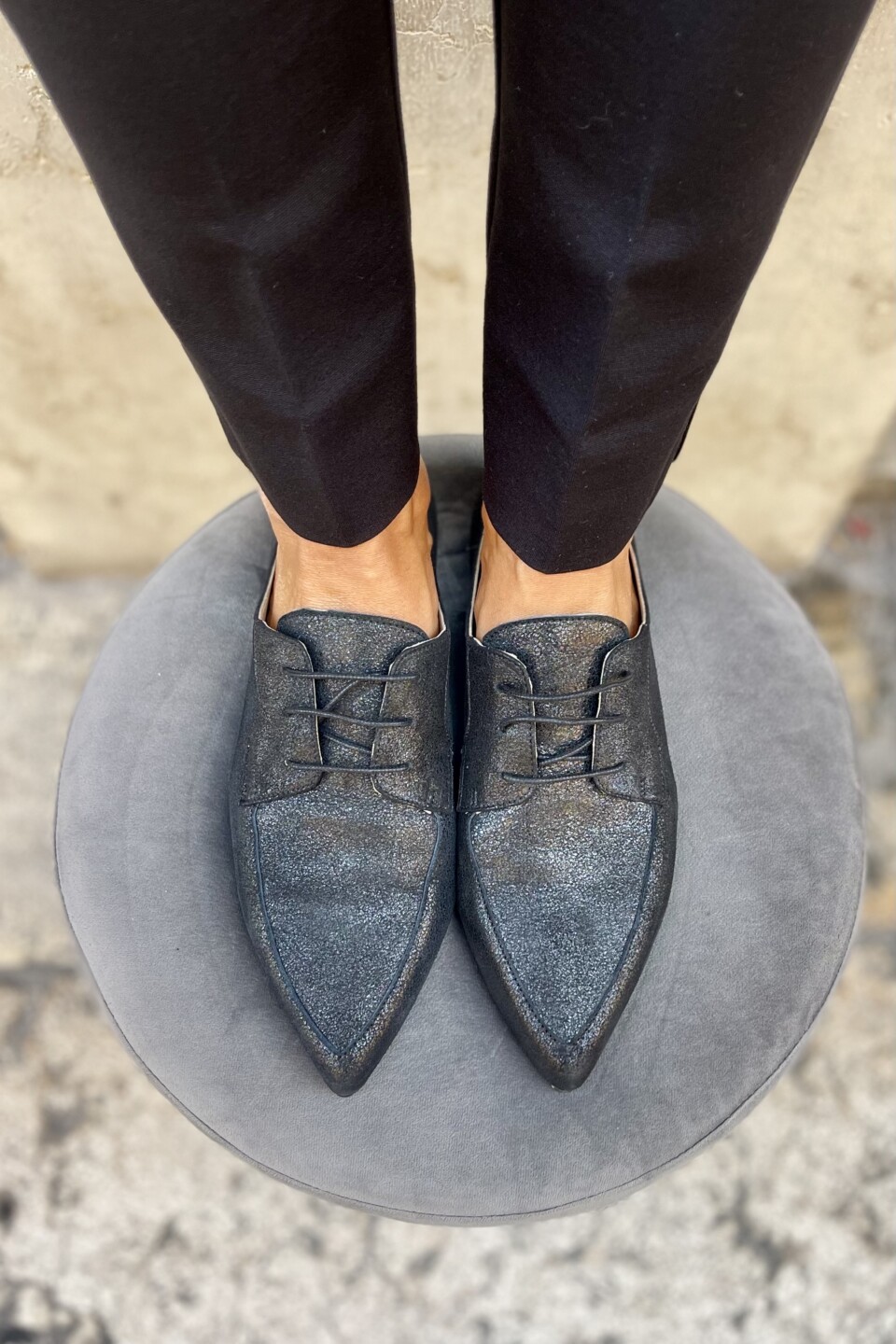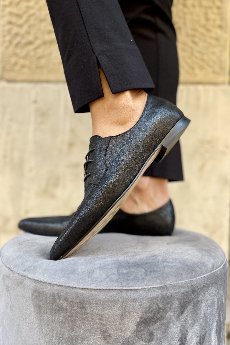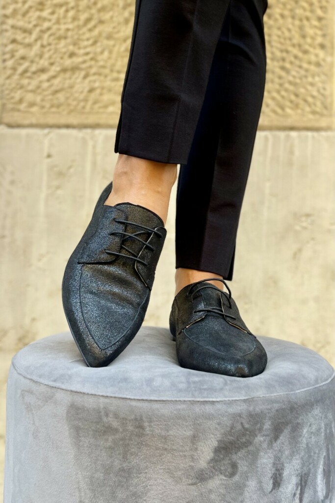 Elegante scarpa stringata da donna in pelle nera effetto laminato . Modello a punta, suola in cuoio, comoda e artigianale. Made in Italy