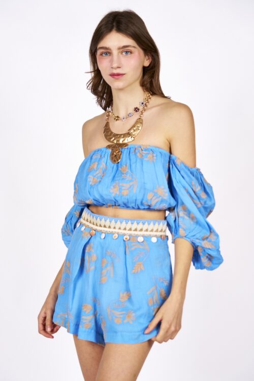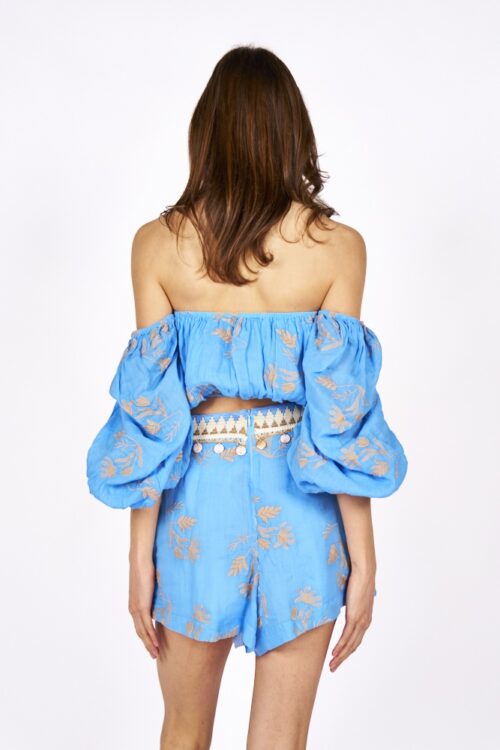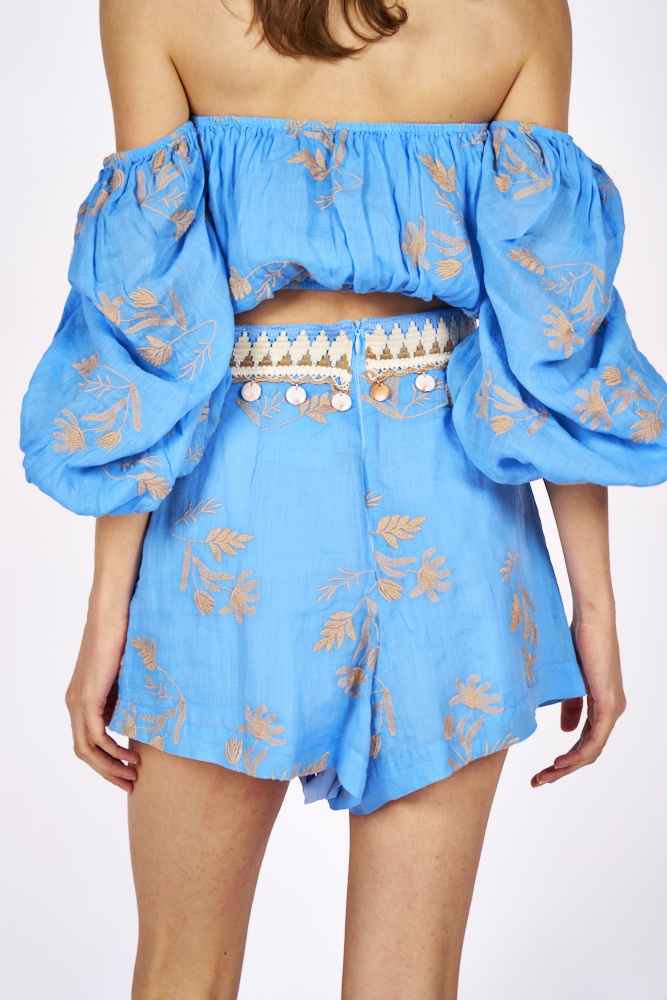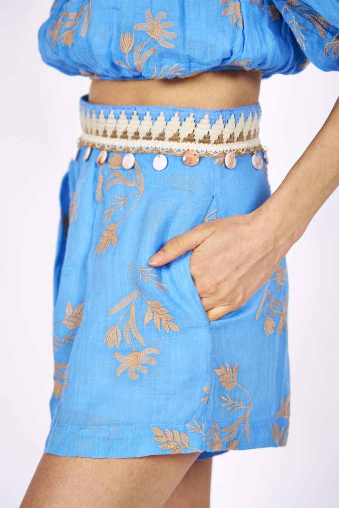Leggeri come una carezza sulla pelle, luminosi come il cielo d’estate. Questi shorts in pura seta trasformano ogni movimento in un gesto elegante, ogni passo in una dichiarazione di stile. L’azzurro delicato incontra romantici fiori ricamati e una raffinata passamaneria ecrù beige, creando un equilibrio perfetto tra femminilità couture e spirito giocoso.