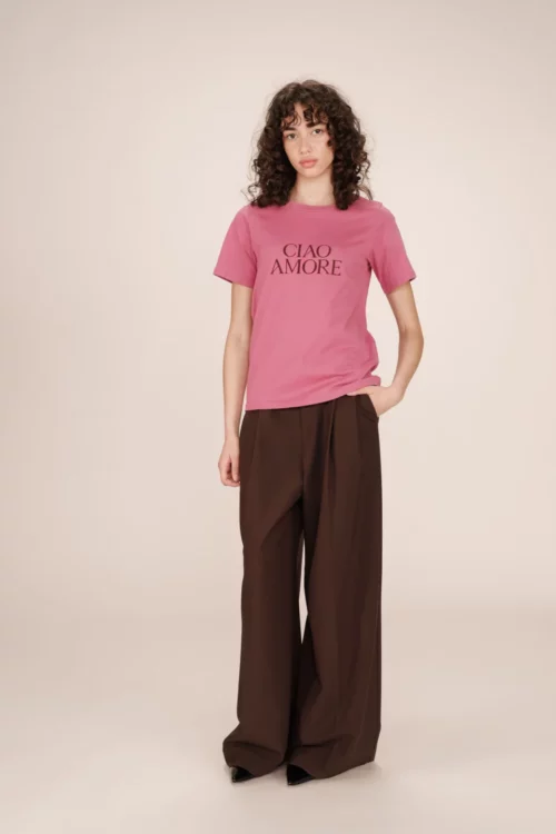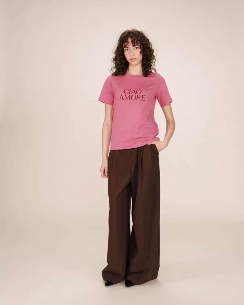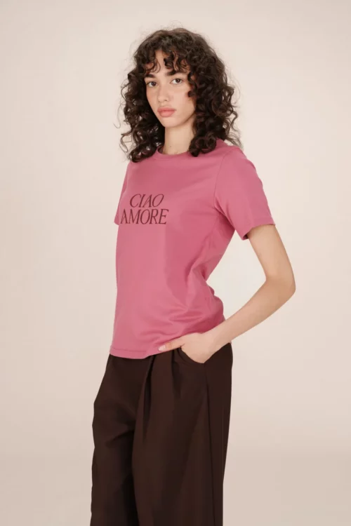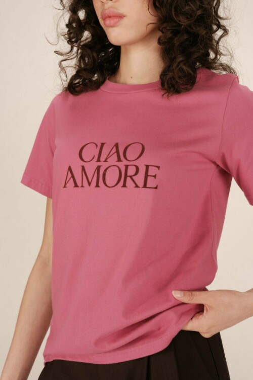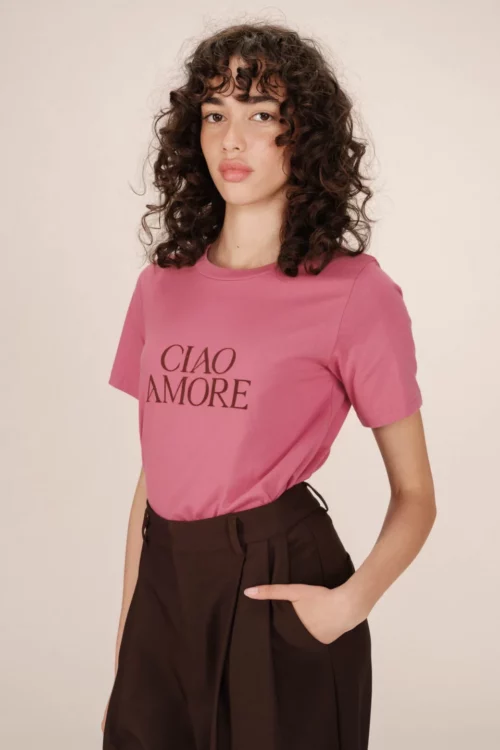 La scritta “CIAO AMORE” in velluto sul davanti aggiunge un tocco trendy e distintivo, ideale per chi ama esprimere la propria personalità anche attraverso lo stile. Leggera e facile da abbinare, questa t-shirt è perfetta con jeans, gonne o pantaloni, per outfit sempre attuali e alla moda.