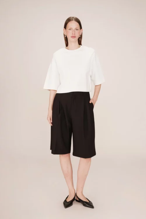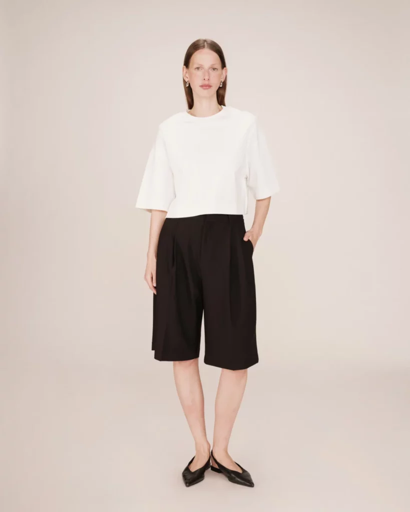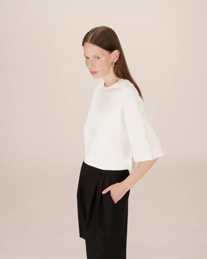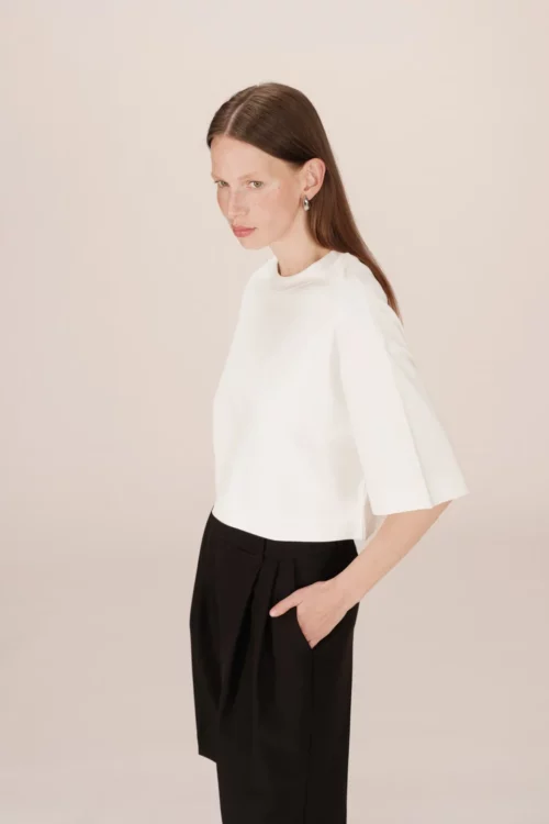Il modello crop top valorizza la silhouette e si abbina facilmente a jeans a vita alta, gonne o pantaloni, per outfit semplici ma di tendenza. Grazie alla linea minimal e al colore bianco, è un capo indispensabile e facile da combinare con qualsiasi stile.