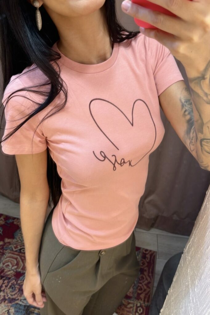 La particolarità di questa t-shirt è la stampa in velluto sul davanti che aggiunge un tocco di personalità e femminilità al capo.